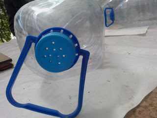 Foram utilizados 3 garrafões de plástico, cortados e encaixados uns nos outros, com a ajuda de fita cola.